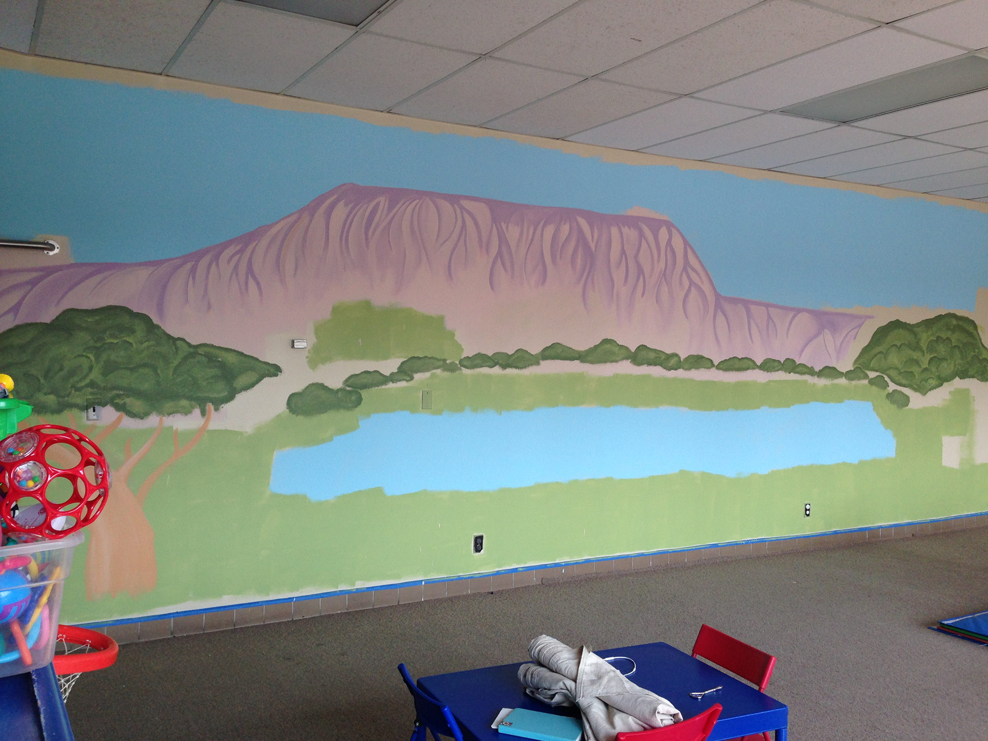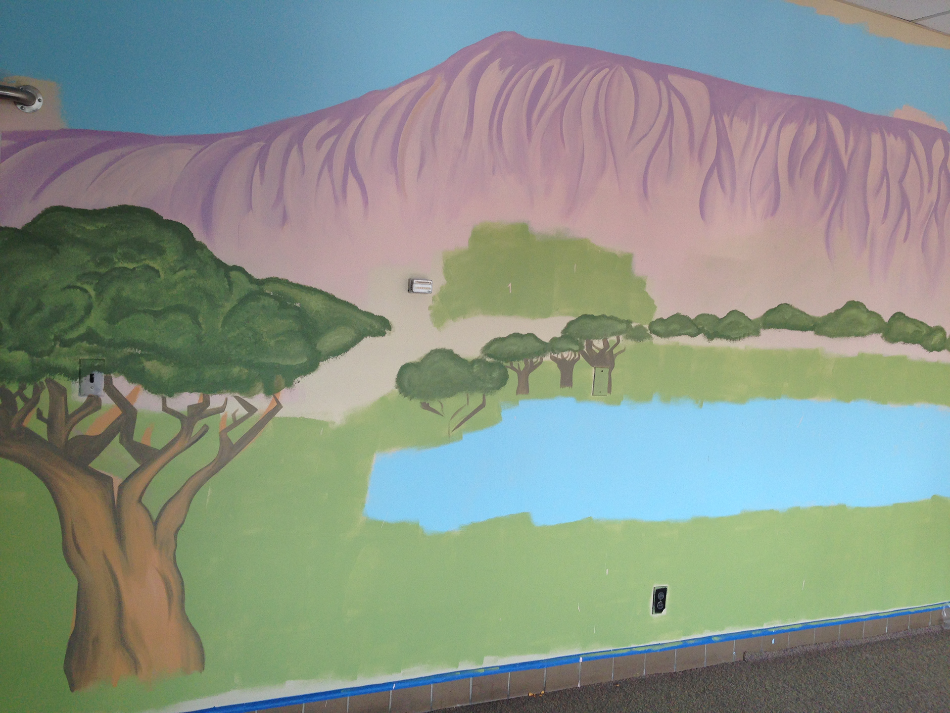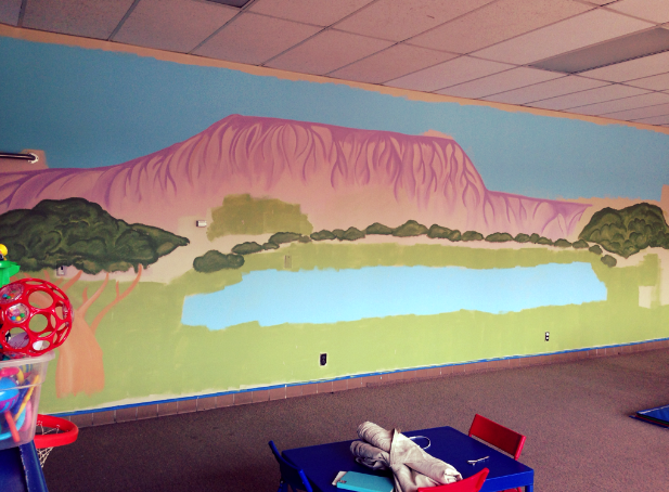 This mural, 40 feet in length and 11 feet in height, was the first mural done under my current business, Courtney's Marvelous Murals, after returning home from Africa. The whimsical whirls and colors make for a perfect nursery setting; the palette not too stimulating but not at all boring.